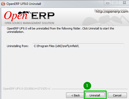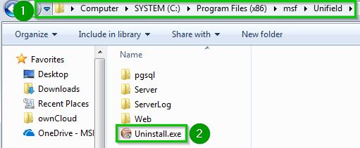 Go to C:\Program Files (x86)\msf\Unifield 1Click on Uninstall.exe 2 | ![]() |