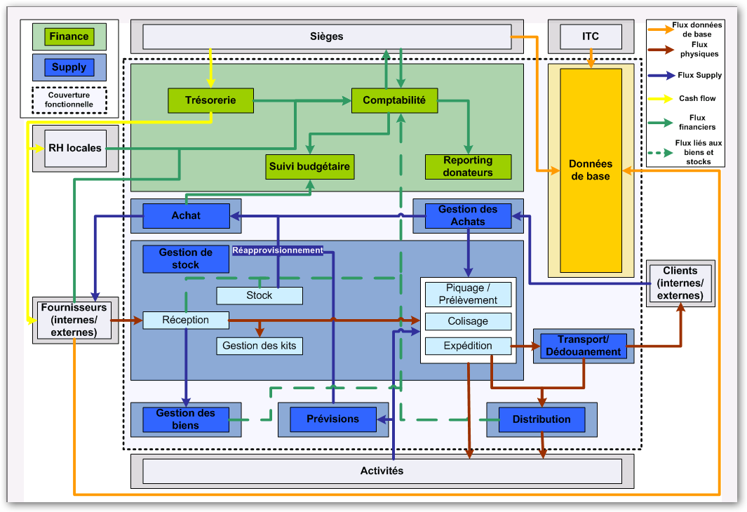 Le graphique suivant schématise les flux standards de chaque domaine d’activité (finance et supply) et les flux entre ces deux domaines.