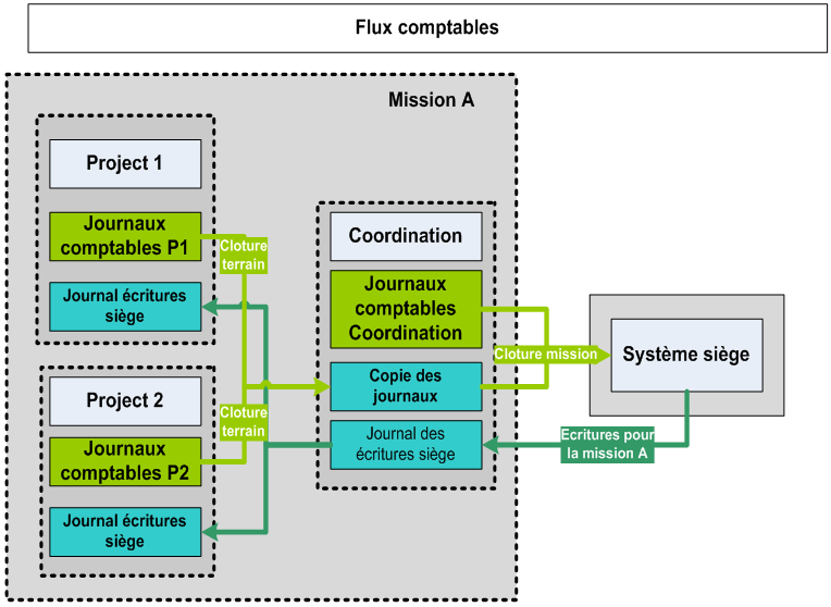 - Flux d’informations financières, disponibles à tous les niveaux opérationnels, afin d’assurer une gestion financière plus optimale. Ces flux comprennent également les écritures passées au siège en faveur du terrain (Entrées HQ).