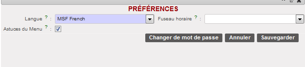 Le bouton préférences peut être utilisé pour modifier les langues et fuseaux horaires. L’activation ou désactivation des fonctions {Astuces du Menu} s’effectue également à partir de cette fenêtre.