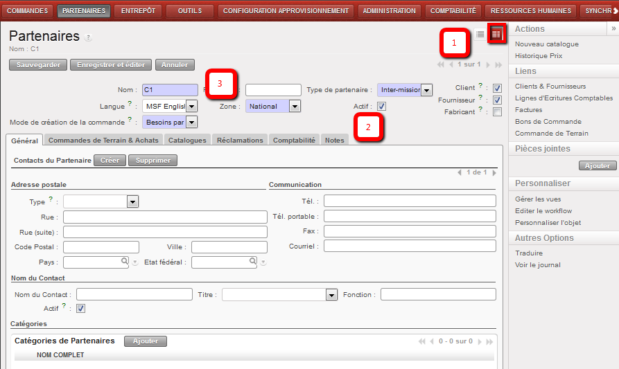 - Onglets spécifiques à l’objet Partenaires à compléter par le service Finance et Supply.