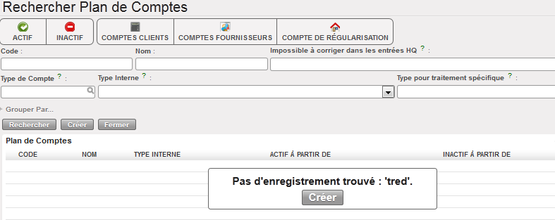 - Loupe: ces champs sont similaires aux champs disposants de liste déroulante mais l’utilisateur est amené à sélectionner une valeur à partir d’un objet spécifique qui s’ouvre ans une nouvelle fenêtre. Ci-dessous le fait de cliquer sur la loupe ouvre une fenêtre avec une liste de codes comptables en lien avec le champ {Compte Client}