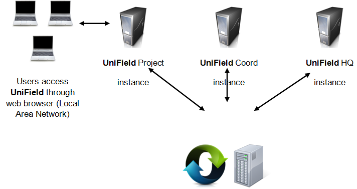 Synchronization is the tool that allows data exchange in UniField. An instance is a UniField installation. It could be a Project, Coordination or an HQ database. In simplified terms, one instance reflects one MSF office and is materialized by a local server that will most often be a dedicated device (laptop or server). The instances exchange data through the synchronization server. Within one instance users can work offline via a local area network, i.e. not connected to the internet or synchronization server. When data is sent from one instance location to another instance location UniField requires the user to log into the synchronization server via an online connection. Synchronization is performed regularly, either on an automatic or manual basis.
