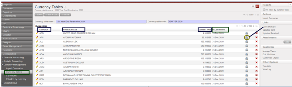 Specific currency tables can also be created to value actual budget rates and explain budget vs. actual discrepancies notwithstanding FX rates variation effects. In addition, specific currency tables can be used to revaluate balance sheet account balances at a year-end closing rate.