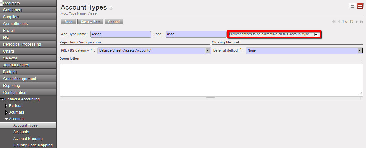 If you want to limit corrections on a specific account type, check the box of the attribute {Prevent Entries To Be Correctible On This Account Type}.