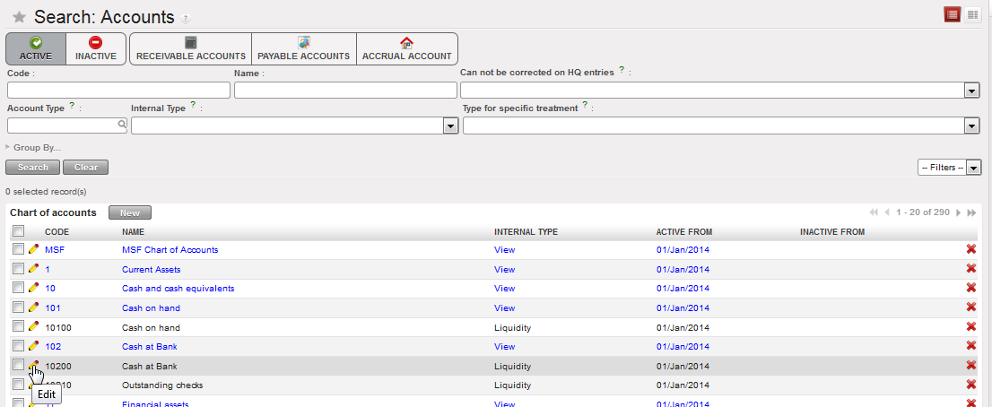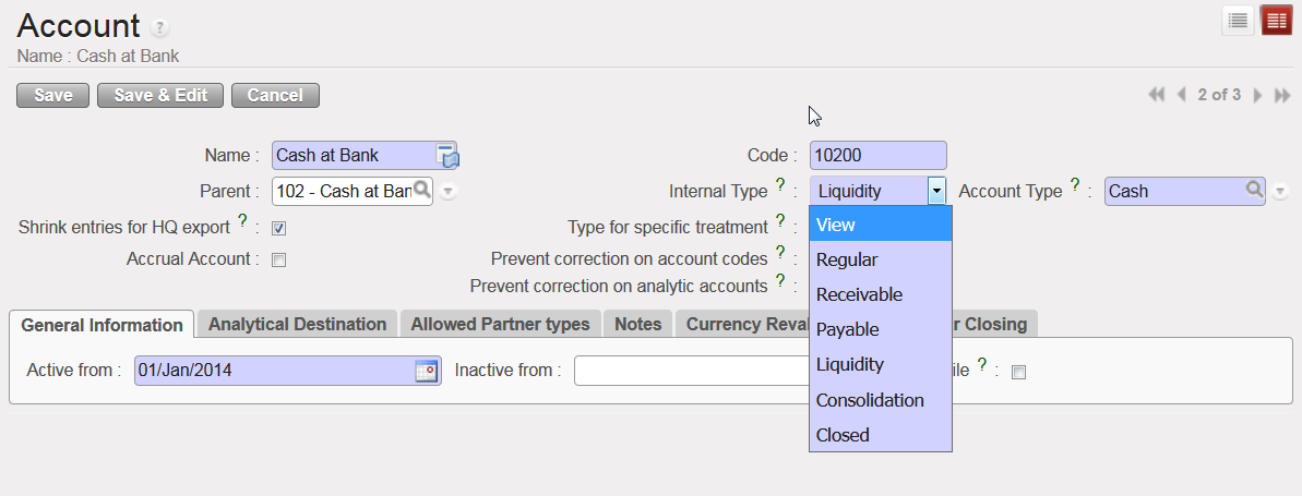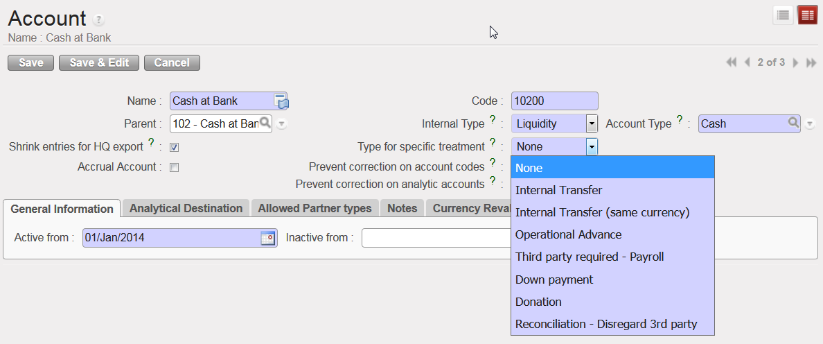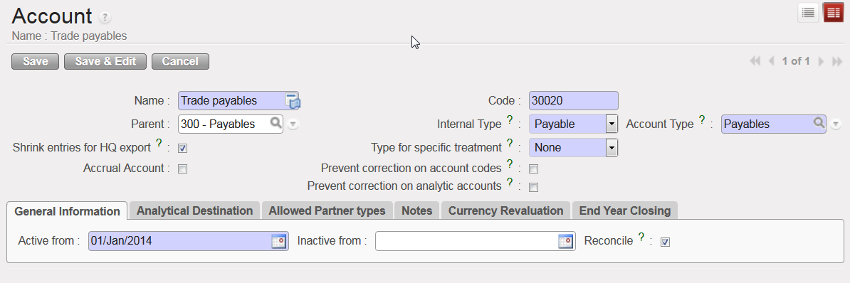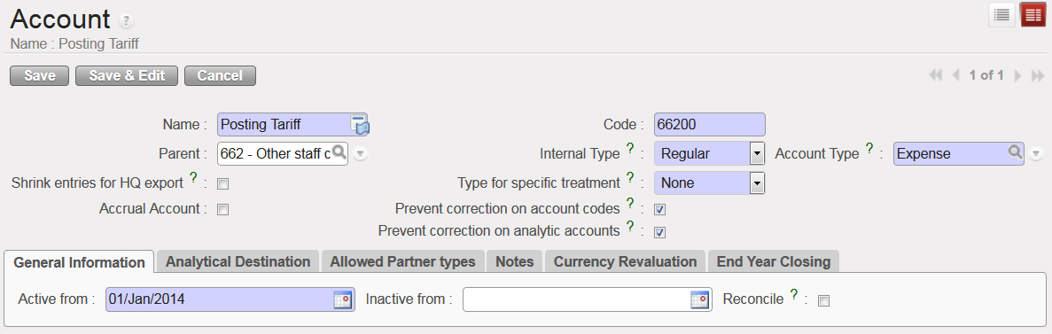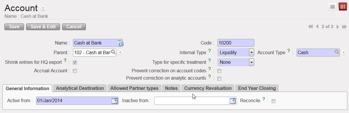 As soon as an account is created in your instance, it is automatically activated. The {Active from} date is visible in the {General Information} tab. When the account becomes obsolete, it can be inactivated. The {Inactive from} date must be the following day of the last day entries can be booked in this account, e.g. if an account is used until 31st December 2017, the {Inactive from} date is 1st January 2018.