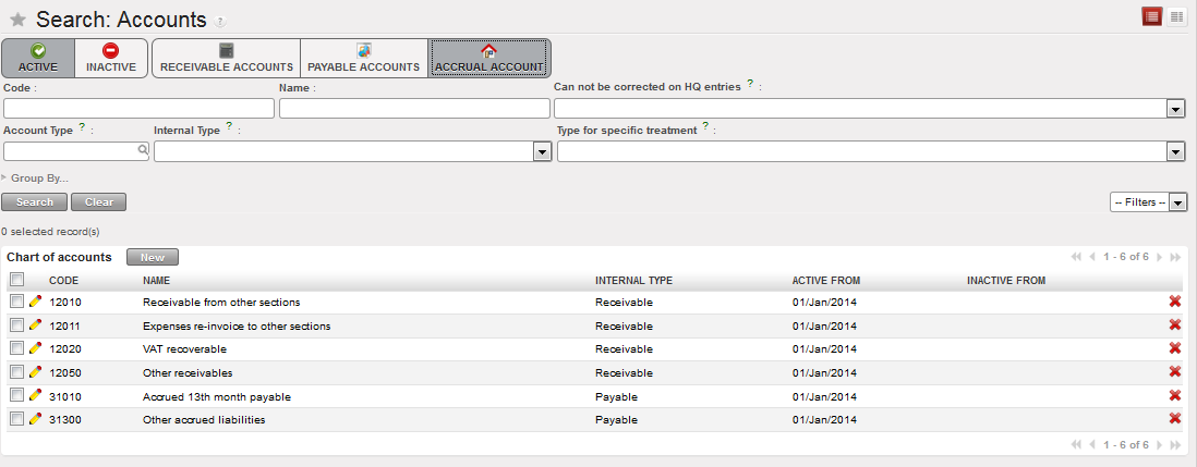 In order to easily retrieve accrual accounts when encoding a transaction, an {Accrual Account} filter is available in the G/L accounts list. If you select this button, it will only show a list of accounts that have the {Accrual Account} box ticked.