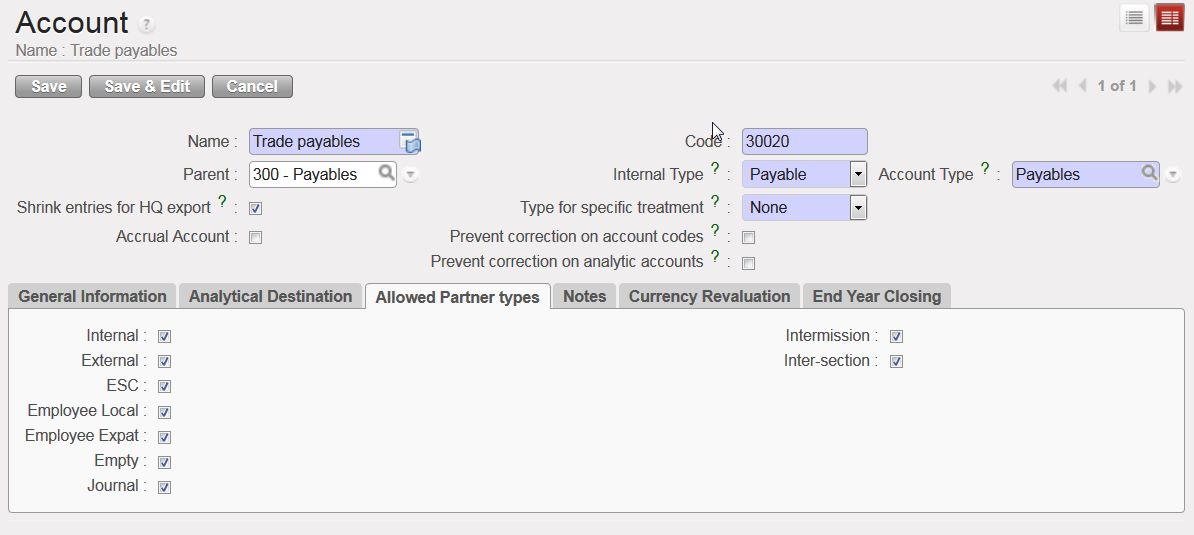In {Allowed Partner Types} tab, the types of Partners allowed to be used for entries in each account can be edited. By default, all Partner types are selected for all accounts and any restrictions on Partners can be done by unticking the box for the specific Partner Type.