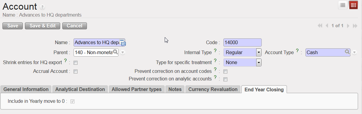 Another account feature is linked to the accounting correction. In the Account Form view, there is a {Prevent correction on account codes} box that you need to select if the account must not be corrected at mission level when importing entries from HQ system. There is also a box {Prevent correction on analytic accounts} to tick to disable changes on analytical distribution. Please note if you tick box {Prevent correction on analytic accounts}, {Prevent correction on account codes} will be ticked as well. Check your section’s procedures to define which account codes should not be corrected in UniField at field level.
