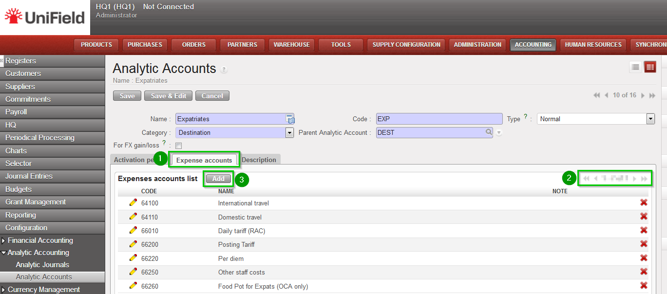 | To create (if you don’t import the destination.GL.link.csv file) or modify manually: Click on Menu Accounting 1, Configuration 2, Analytic Accounting 3, Analytic Accounts 4 Choose account Expatriates (EXP) and click on the edit icon 5. | ![]() |
