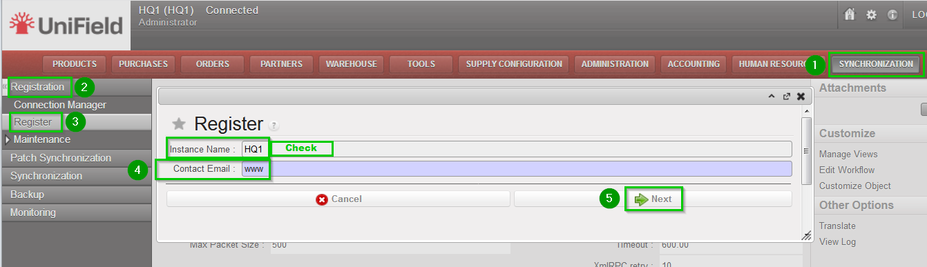 | Register: Click on Menu Synchronization 1, Registration 2, Register 3 A new wizard will open Check that the instance name matches the HQ database name as defined in the installation checklist Enter contact email www 4Click on Next 5 | ![]() |