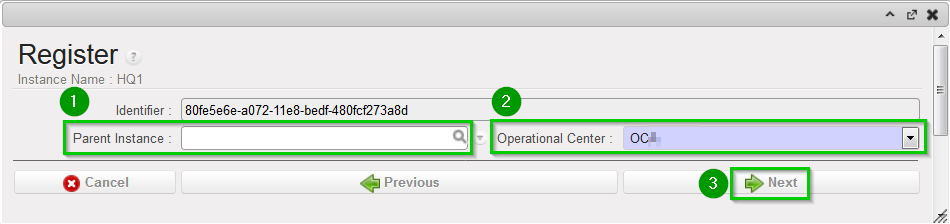 | Leave Parent Instance empty1 Select your Operational Center 2 Click on Next 3 | ![]() |