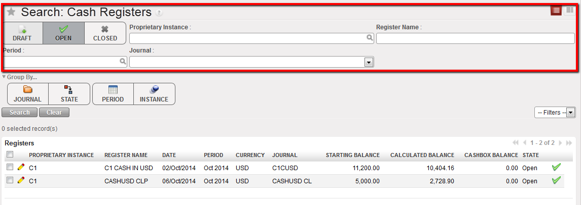 Finally, a register Search view will display a list of registers as shown below. You will be able to use a set of filters to easily retrieve the register in which you want to record your entries.