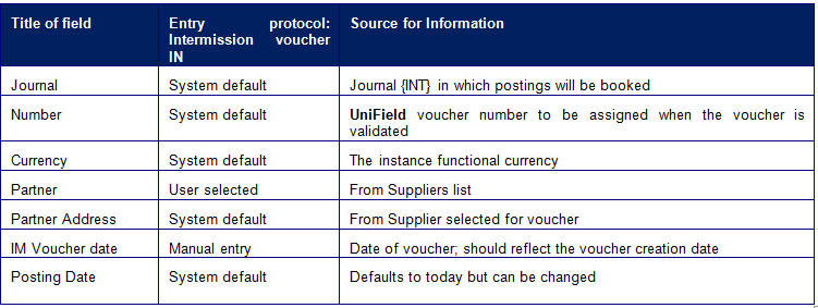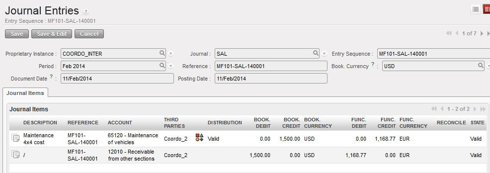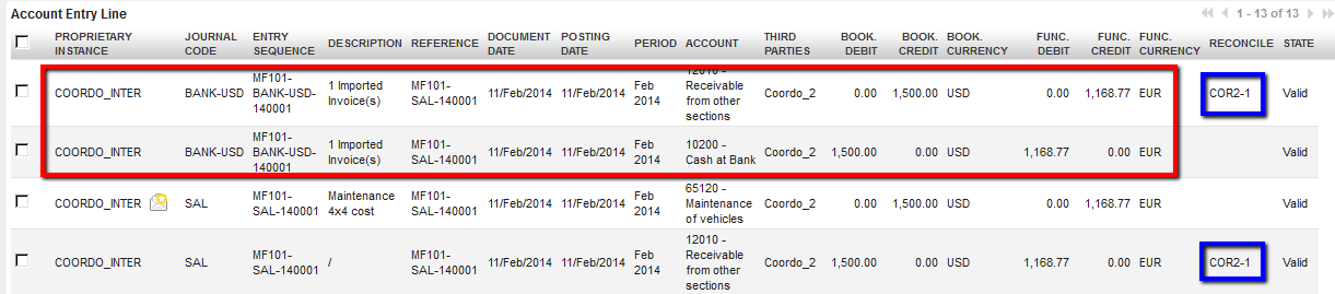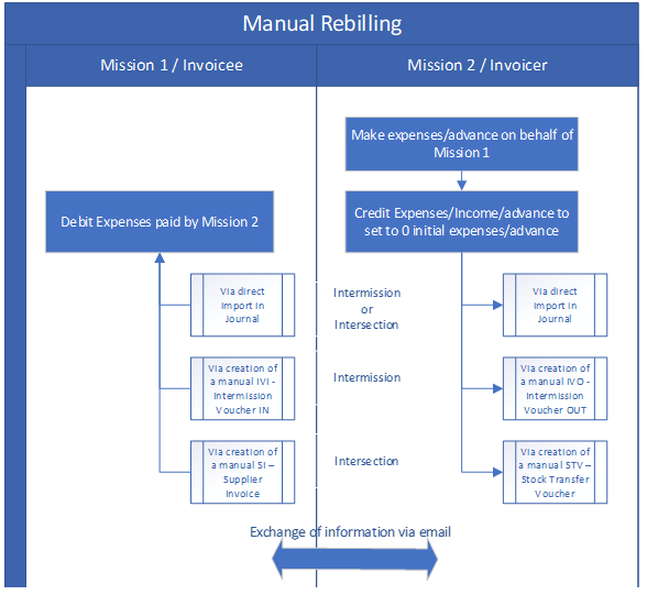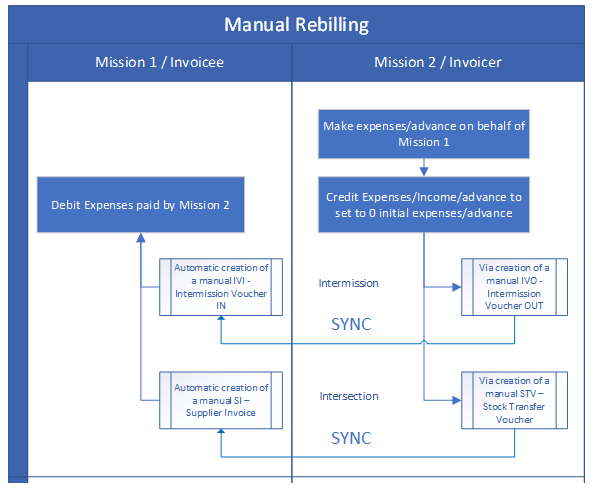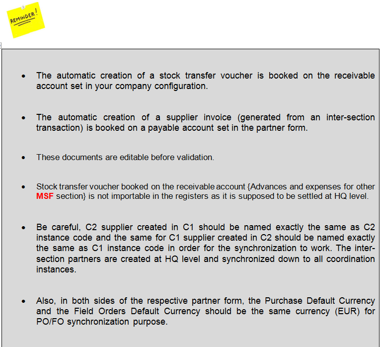 In configuration for inter-mission supplier: Account receivable and Account Payable (14010 – Advances or expenses for other missions) In configuration for inter-sectional supplier: Account receivable (12010 – Receivable from other sections) and Account Payable (30010 – Payable to other sections) |