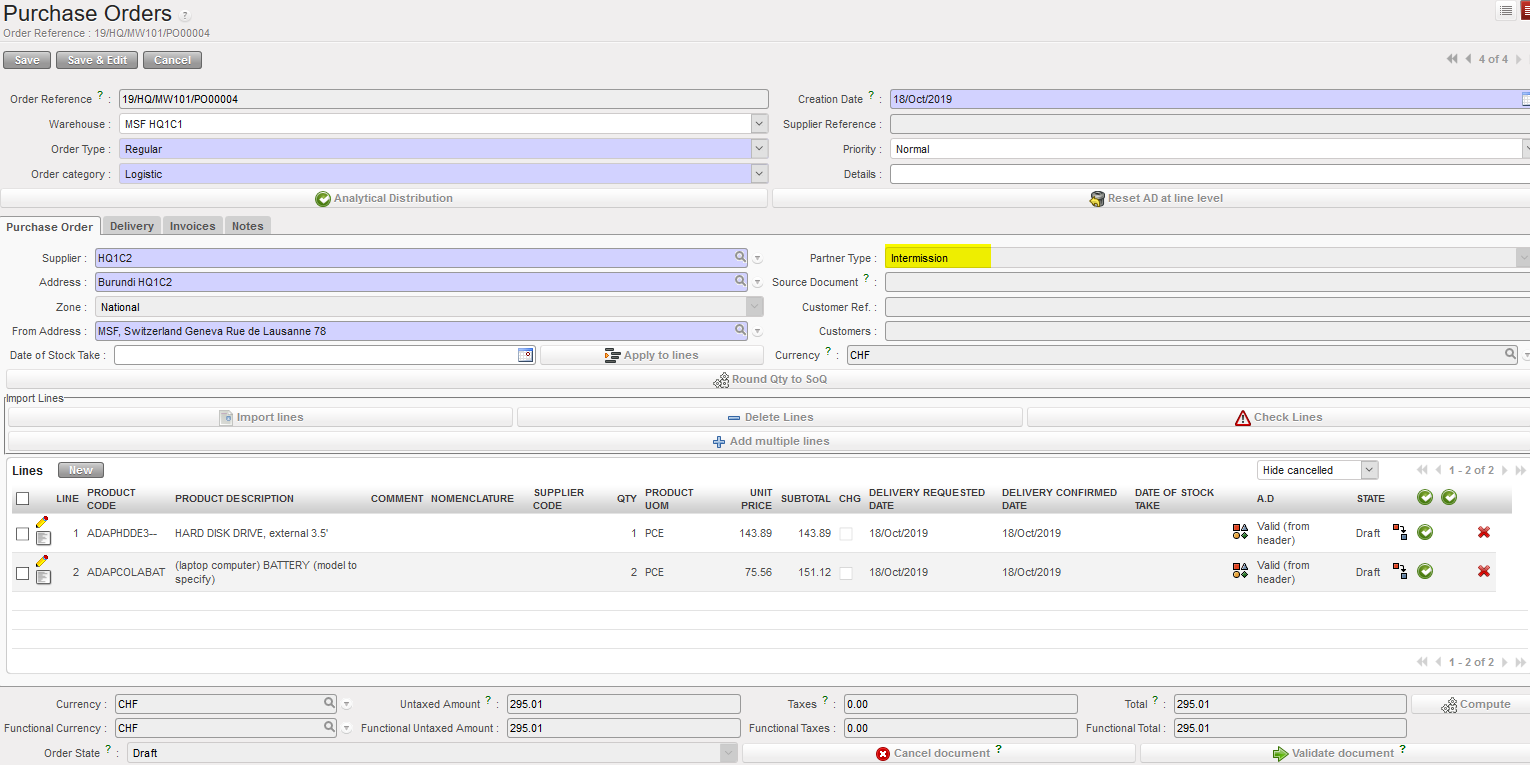 - A PO is created by the requester mission HQ1C1, with the provider mission HQ1C2 as a supplier. (Done by a supply user not a finance user)