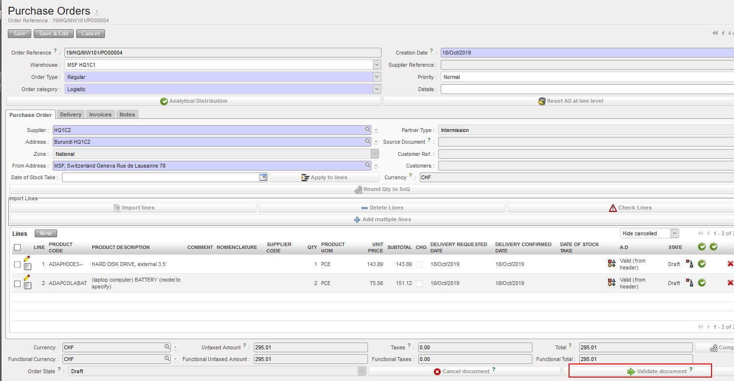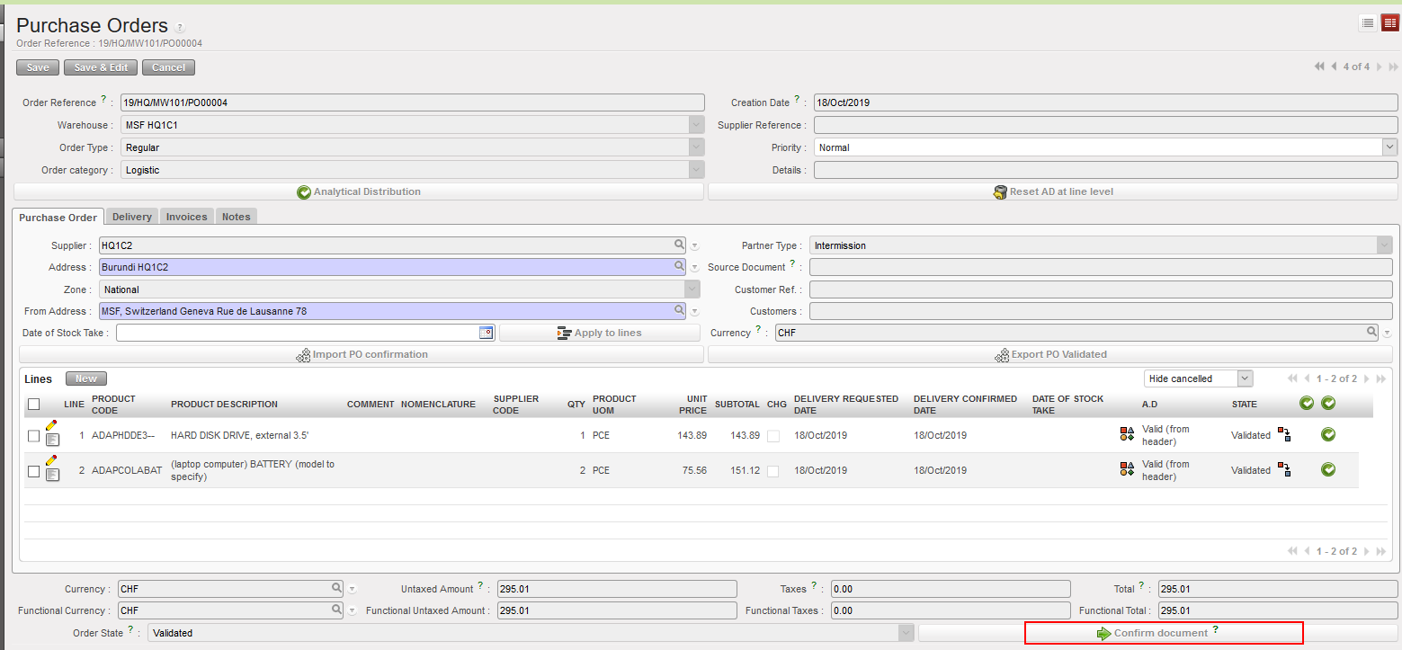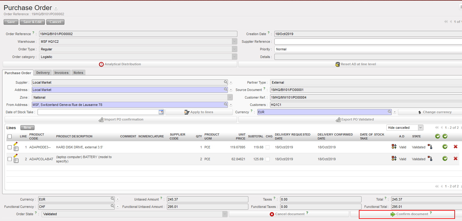 2. After inserting all the required information, the PO should be validated then confirmed. (Done by a supply user not a finance user)