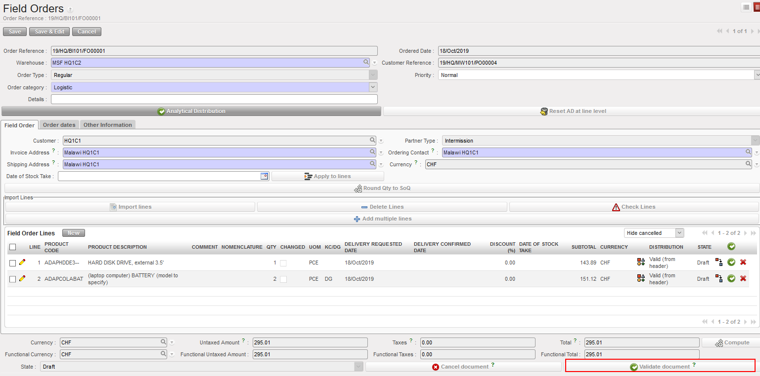 - Before validating the FO, you will need to update again the Analytic Distribution and then you validate but don’t confirm the document. (Done by a supply user not a finance user)
