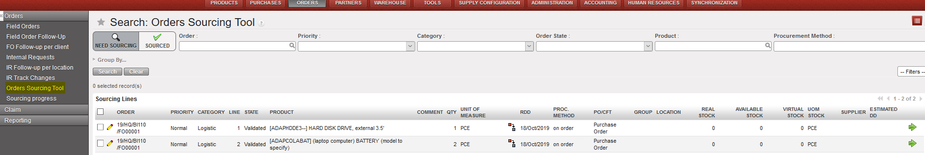 4. Go to Orders Sourcing tool to source the document (Sourcing: is choosing from where you want to order the requested items, either from the warehouse or from an external supplier) in our case here, we will choose to order the items from external supplier. Either you select the supplier on each line separately and then you click on the green arrow to source or select all and click on Source lines in the right side menu in case you want to order the items from the same supplier then save and source. (Done by a supply user not finance user)