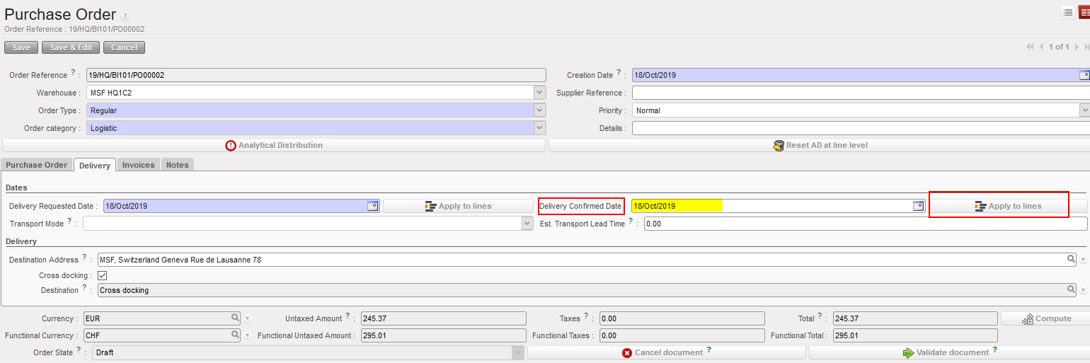 7. After checking all the information and apply the delivery confirm dates to all lines, you can validate then confirm this PO. (Done by a supply user not a finance user)