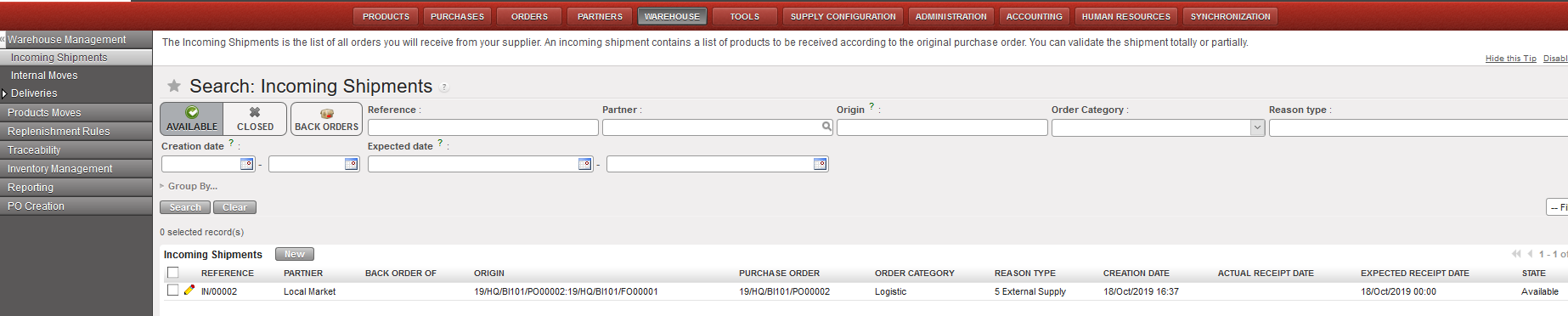 8. Once the PO is confirmed, the incoming shipment will be created. (Done by a supply user not a finance user)