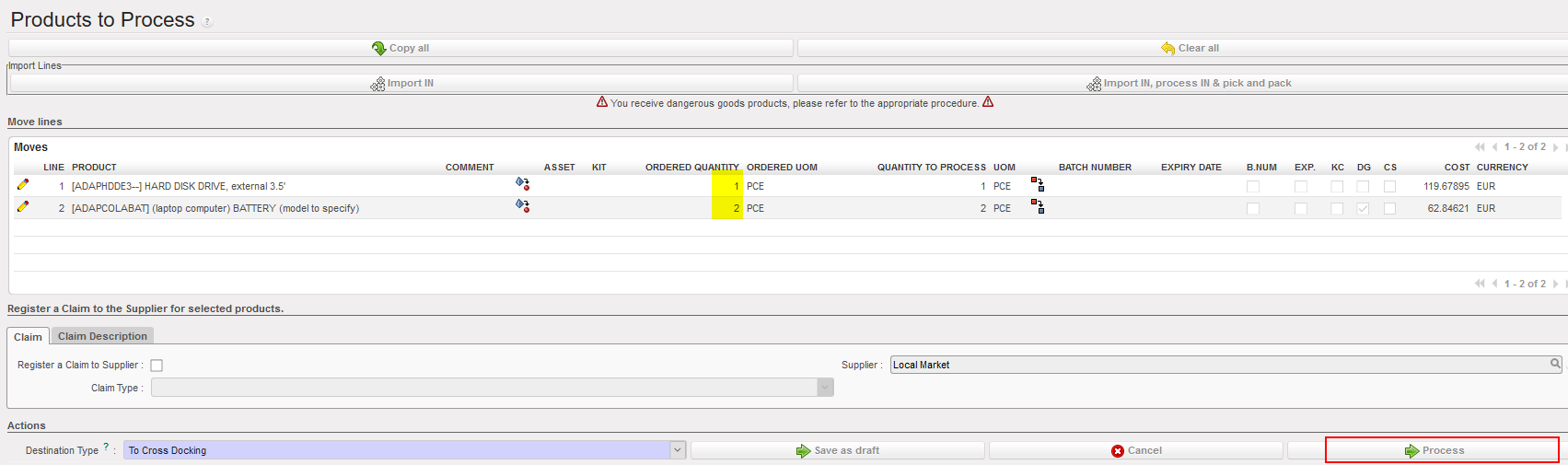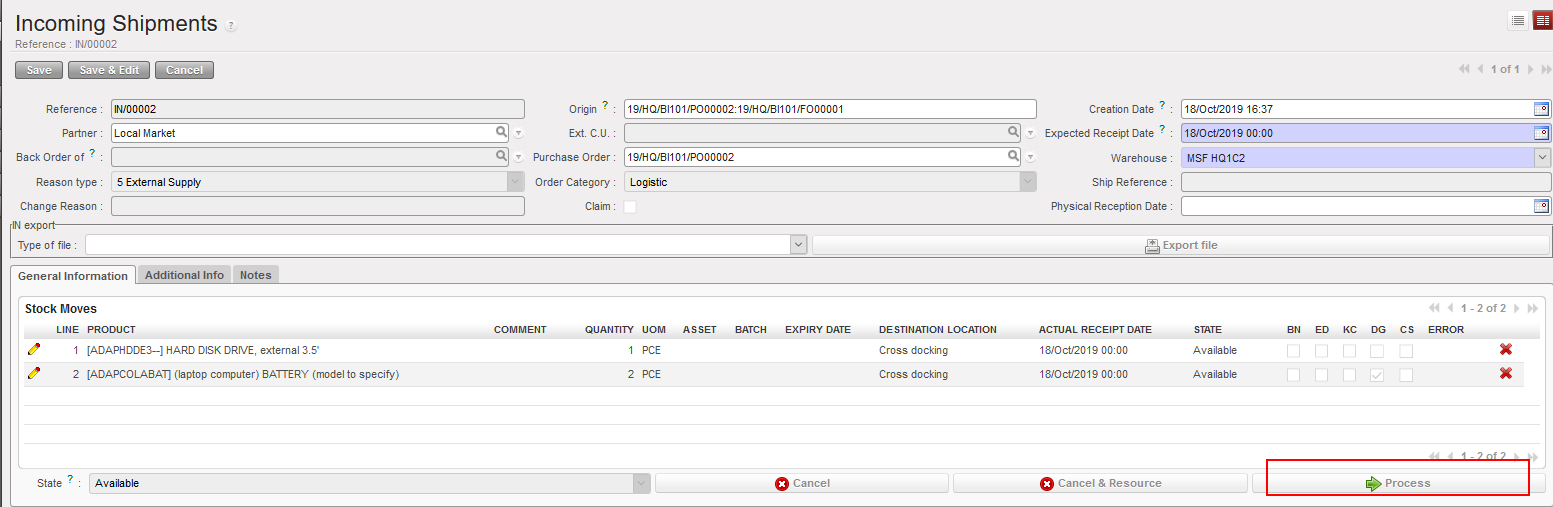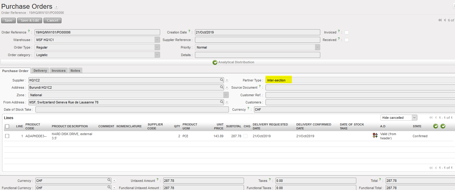 6. Same process as in inter-mission, validate and confirm the PO after checking all the information => confirm the incoming shipment in the warehouse when the items are received. After doing the picking with convert simple out and process, a stock transfer voucher will need to be validated.
