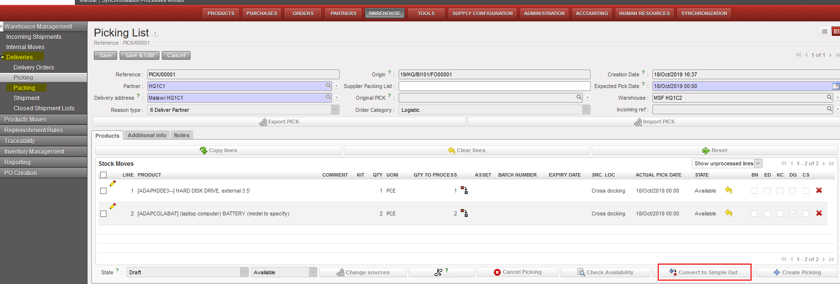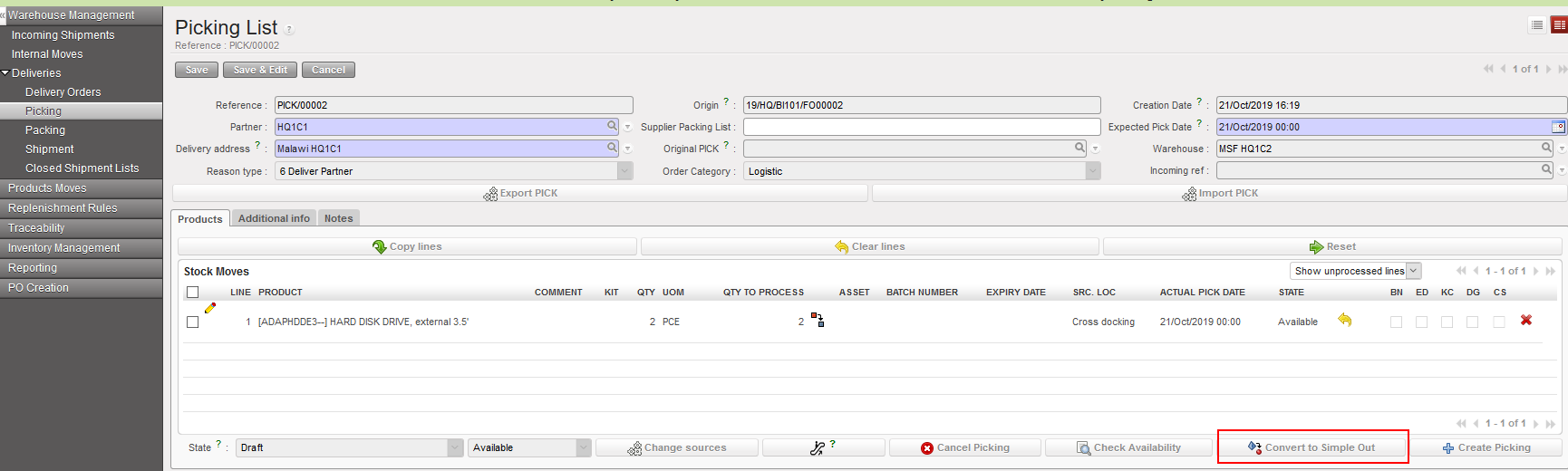 10. To do the picking of the items, go to Warehouse Management/ Deliveries/ Picking/ Convert to Simple Out/ Copy all/Process (Done by a supply user not a finance user)