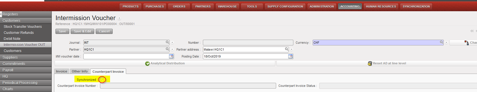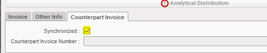 3. From Counterpart invoice, tick the Synchronized check box and then validate the IVO