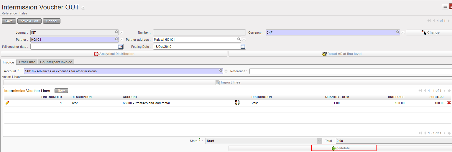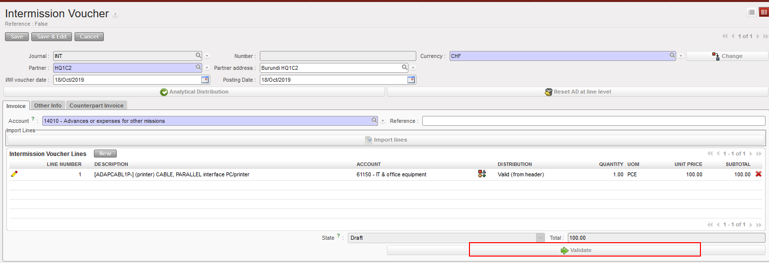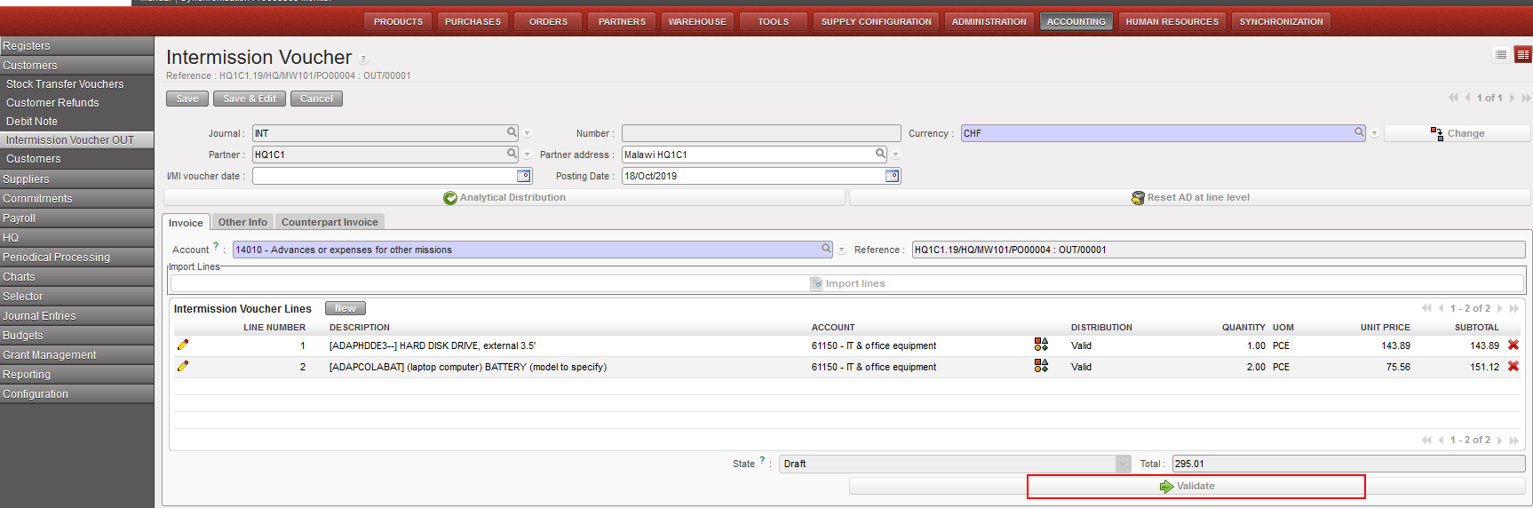15. The finance user should check all the information if all were correct (including accounting code and analytic distribution), then the IVI should be validated. (Done by a Finance user)