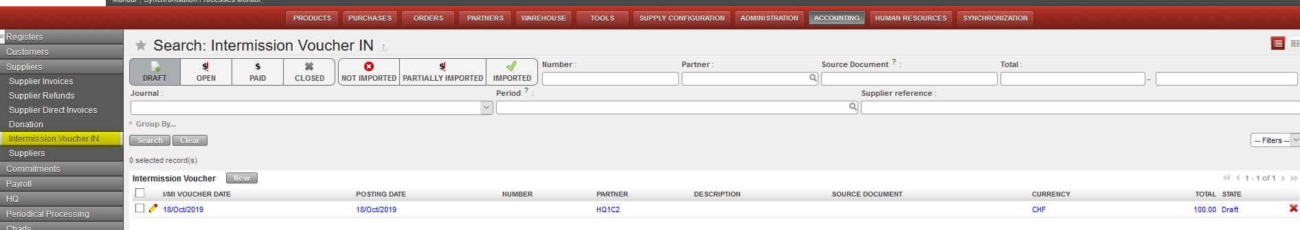 Go to Accounting/ Suppliers/Intermission Voucher IN