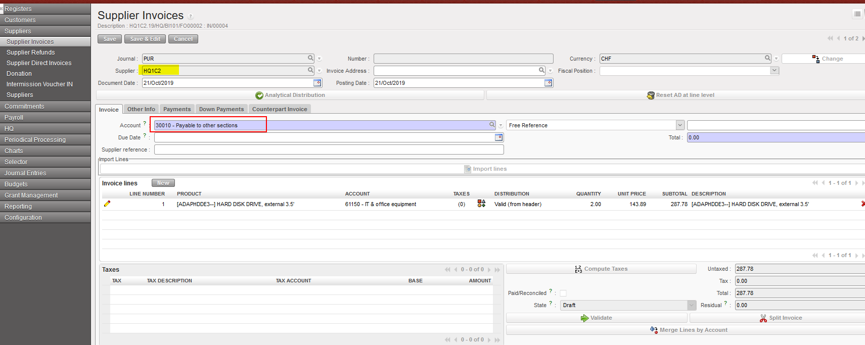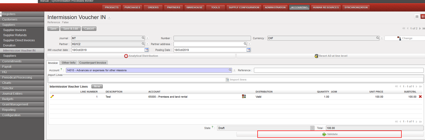8. After the synchronization is done in the two instances, a supplier invoice will be created automatically in the requester mission HQ1C1 with the provider mission as a supplier. The payable account will be Payable to other sections. The process then as usual, check all the information then validate the invoice.