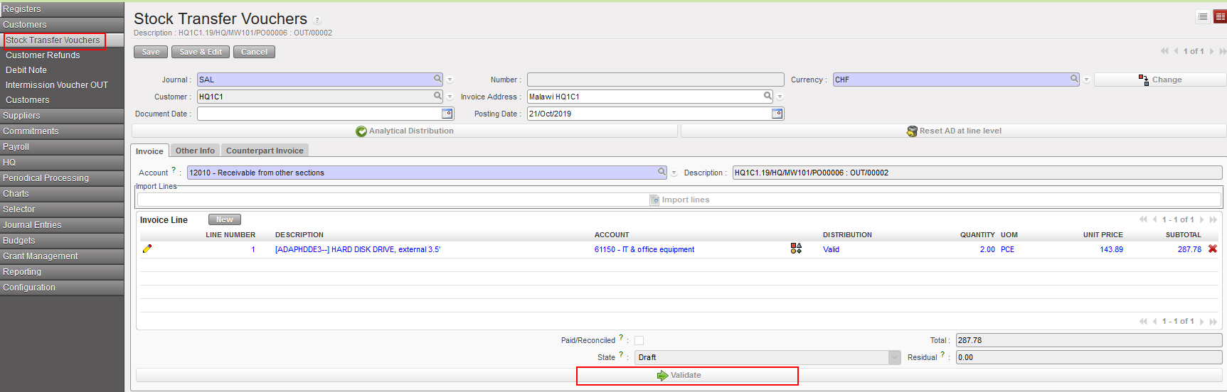 7. Go to Customer/Stock Transfer Voucher/ Check all the information and then validate (Note: the synchronization check box will be already ticked and cannot be edited)