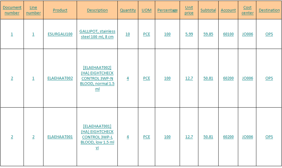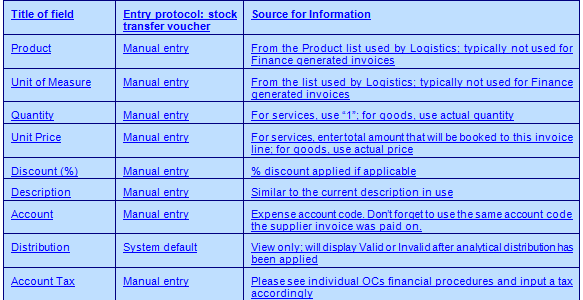 to open the form. - Change the relevant fields if necessary. You should carefully review the accounts, destinations, cost centers and funding pools assigned to each product on the voucher invoice. Remember that accounts and analytical distribution must be identical to the supplier invoice you have paid.