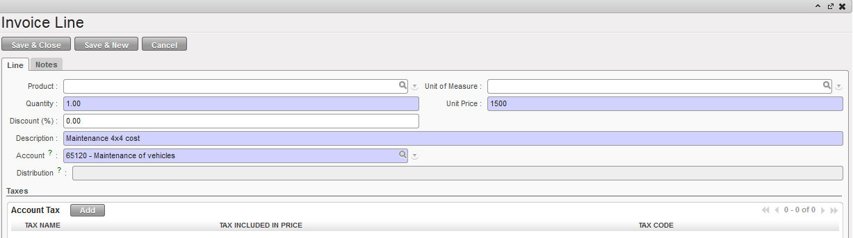 4. Click {Save & New} button for additional invoice lines, or click {Save & Close} button to return back to the supplier invoice window.