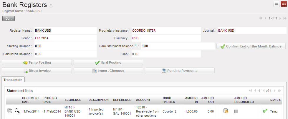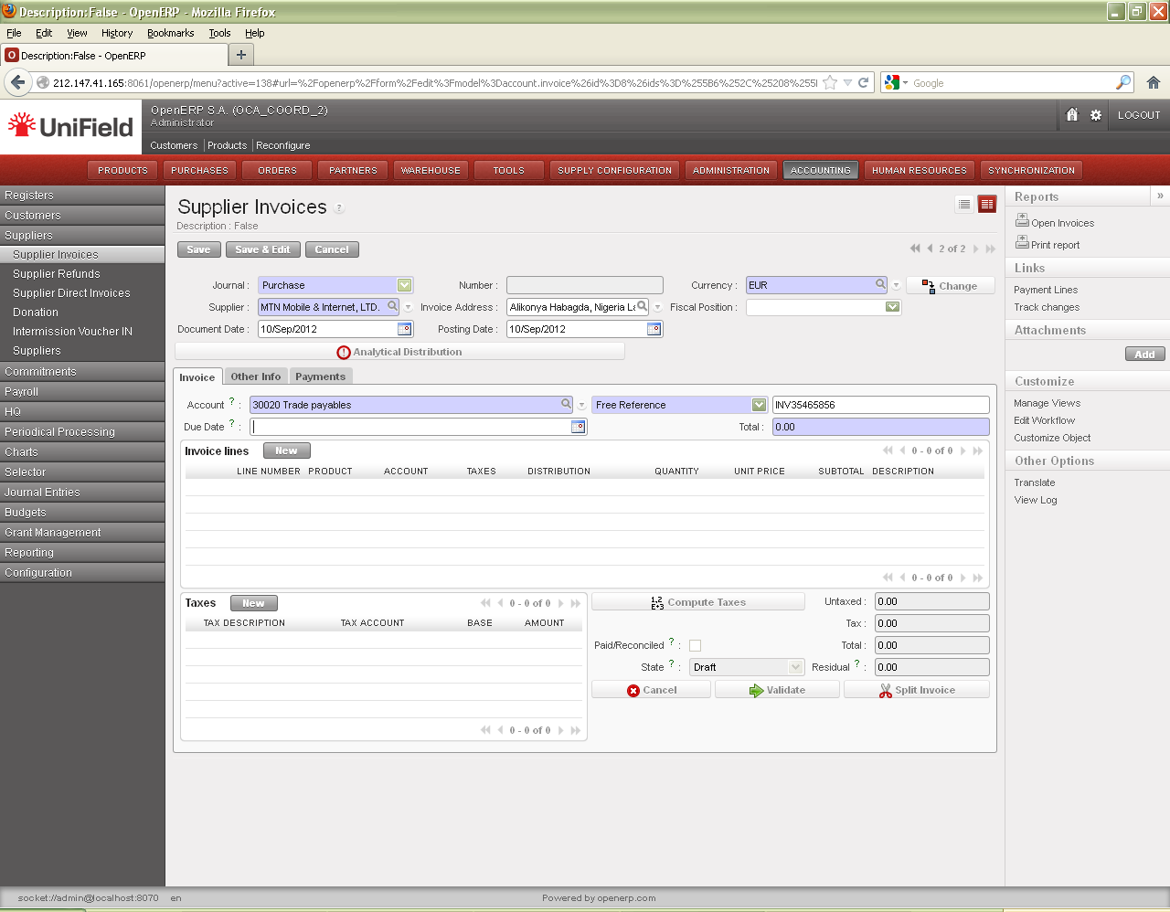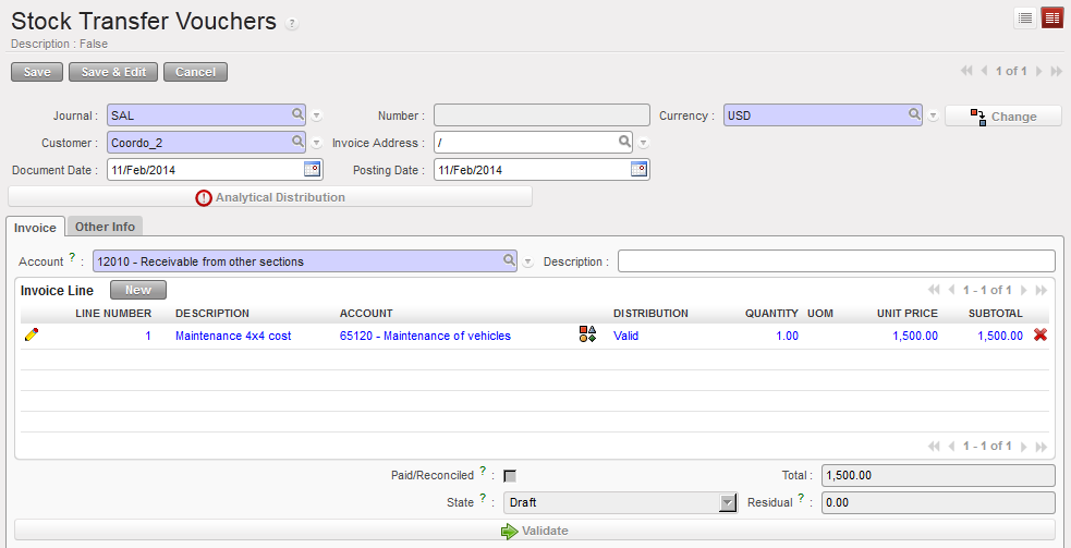 7. Save. The invoice is created in {Draft}, waiting for validation.