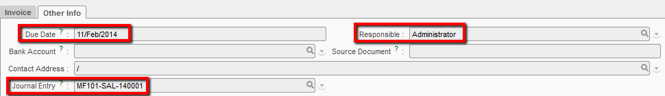 6. In the tab {Other info}, complete the {Due Date}. The {Journal Entry} is linked to the accounting entry booked in the sales journal once the voucher is validated. {Responsible} identifies the user who validated the voucher. The other fields are automatically completed if they were recorded in the client’s form.