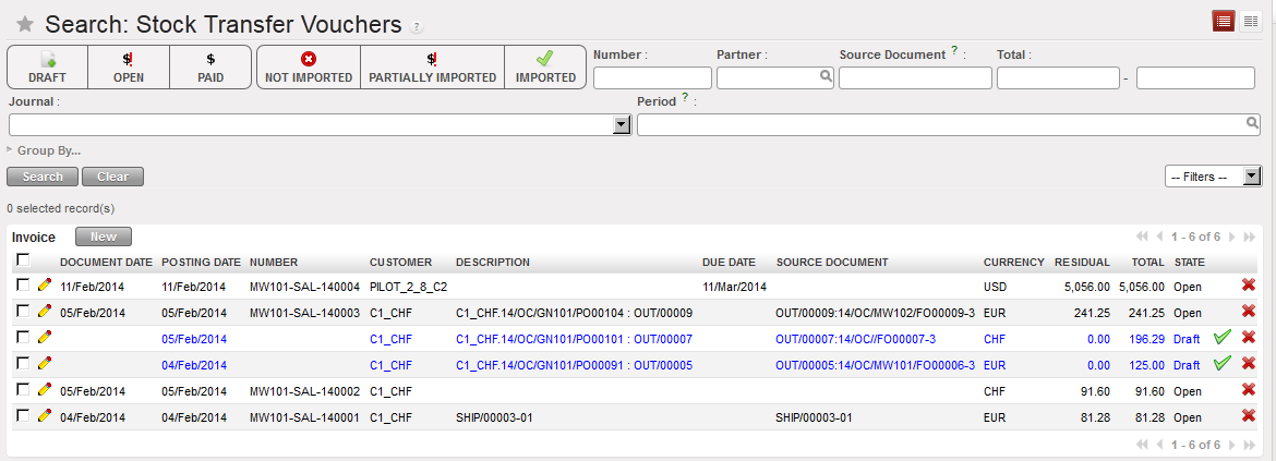 Like supplier invoices, validating a stock transfer voucher will create accounting moves in the journals.