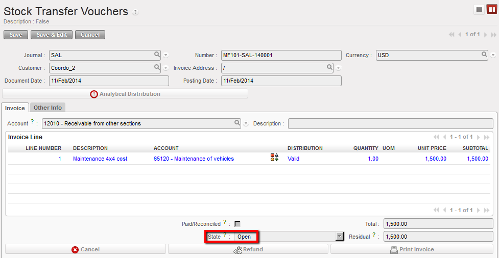 Payment of a stock transfer voucher changes state to {Paid} and automatically reconciles the journal items. At this stage you can use the {Refund} option from the stock transfer voucher.