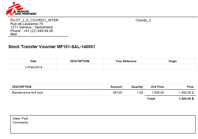 On the other side, a supplier invoice will have to be created manually with the same information than the Stock transfer voucher. The counterpart accounting code will be {30010 – Payable to other sections}.