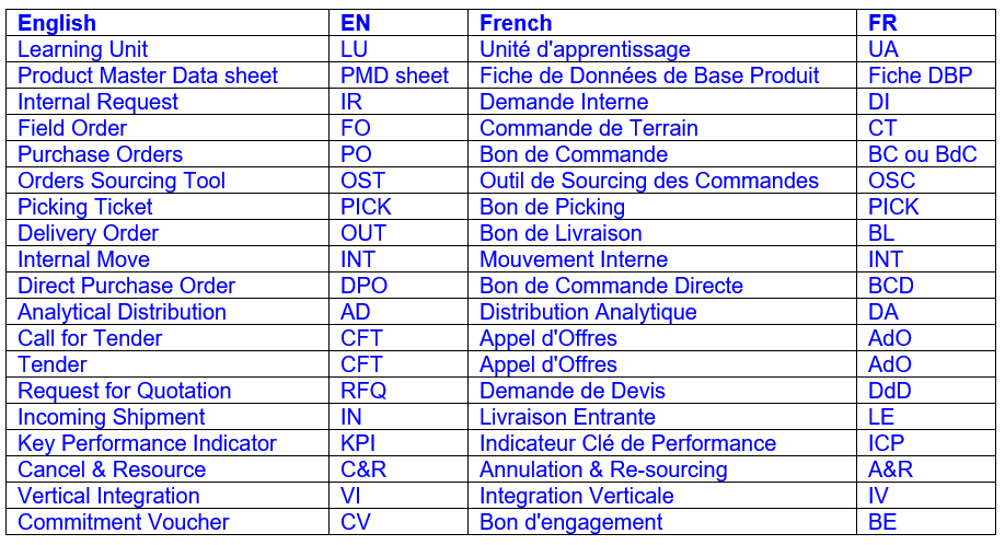 A travers ce chapitre, vous rencontrerez beaucoup d’acronymes. Ils sont principalement utilisés pour raccourcir des mots anglais mais sont utilisés dans le manuel en version anglaise comme dans celui en version française (i.e. vous trouverez l’acronyme PO –pour Purchase Order– dans la version française du manuel afin de désigner un Bon de Commande). Dans la table ci-dessous, vous trouvez les principaux acronymes utilisés dans ce chapitre et leur signification. Les acronymes français, tout comme les noms des documents en français dans une moindre mesure, sont peu utilisés. On leur préfère les acronymes et noms de documents en anglais. Dans le logiciel, les références (numéros) des documents comportent d’ailleurs presque toujours l’acronyme anglais du document (e.g. 18/IR00019, 18/HQ/MW101/FO00033, 18/HQ/MW101/PO00045,…), indépendamment de la langue dans laquelle le logiciel est utilisé.