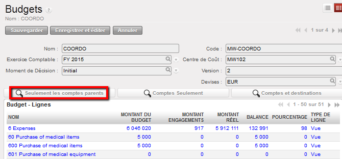 L’affichage Budget – Seulement les comptes parents- reprend les lignes budgétaires consolidées. Il s’agit d’une synthèse des totaux au niveau des comptes parents, p. ex. 600 Achat articles médicaux, 601 Achat articles non médicaux, etc.