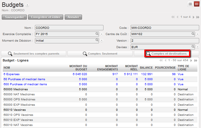 L’affichage Budget – Comptes et destinations reprend les comptes de charges de chaque couple dépense/destination existant dans le système.