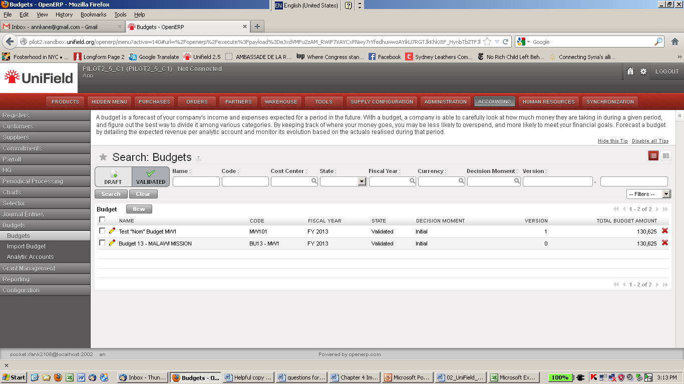 Au sein d’UniField, la gestion budgétaire consiste à suivre les dépenses réelles par rapport aux dépenses prévisionnelles. Les budgets sont élaborés en dehors d’UniField et importés dans le système via un document au format csv. Chaque instance (coordination et projet) doit importer ses propres budgets. Une fois importé, le budget est créé en mode Brouillon. Un utilisateur autorisé doit revoir cette version avant de la valider. À partir de ce moment, les lignes budgétaires ne peuvent plus être modifiées et sont synchronisées avec les autres instances.