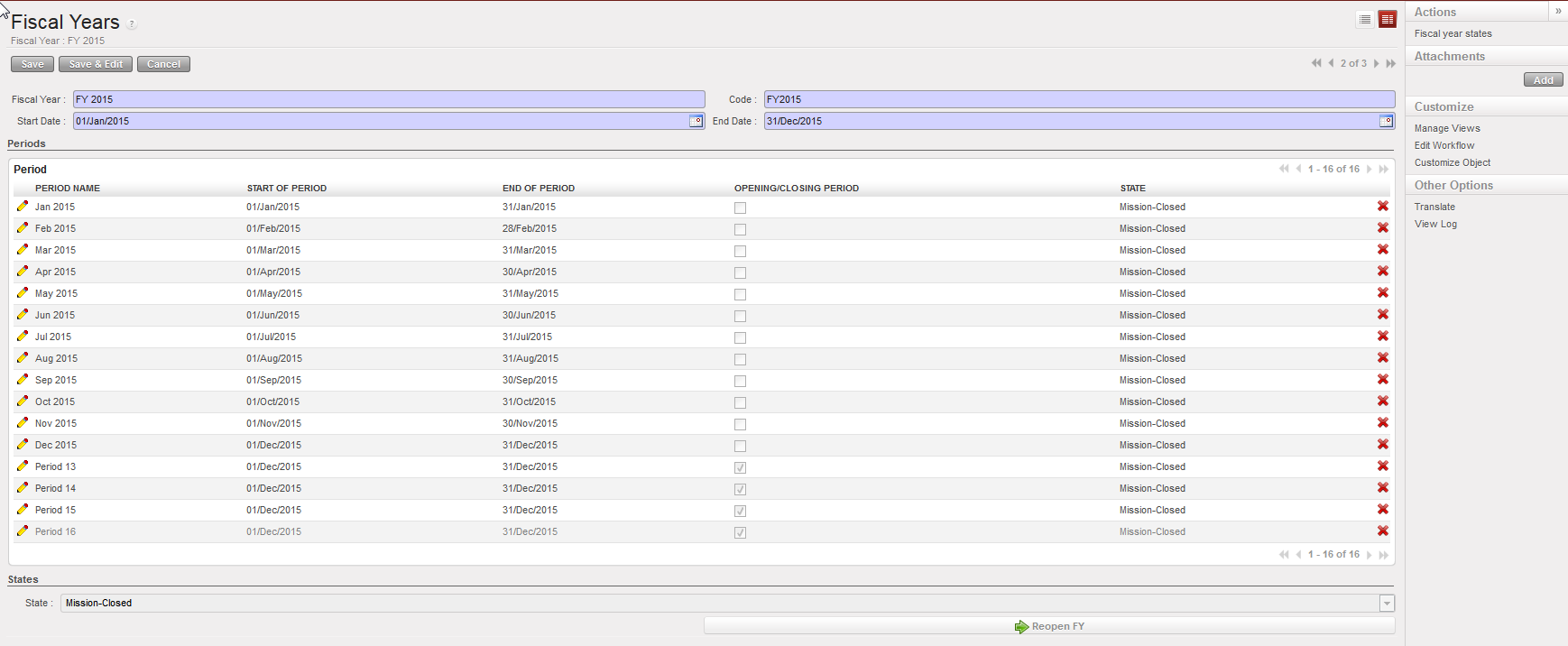 - Go to Accounting/Configuration/Financial Accounting/Periods/Fiscal Years/ to see that the status changed from {Open} to {Mission-Closed}