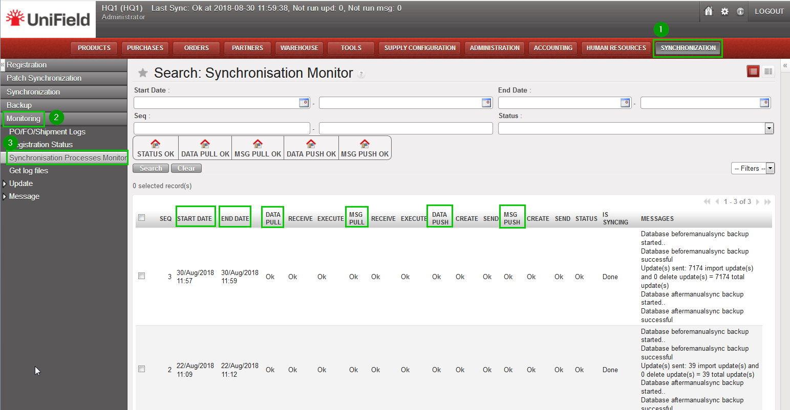 Click menu Synchronization 1, Monitoring2, Synchronisation Processes Monitor3.