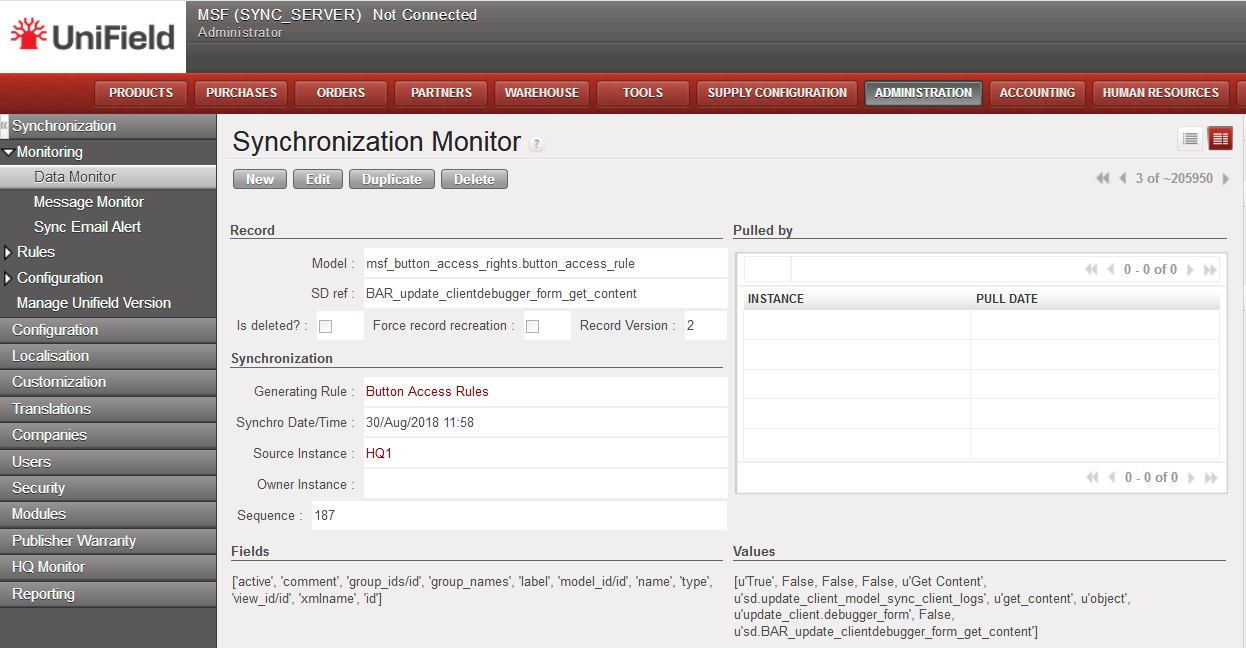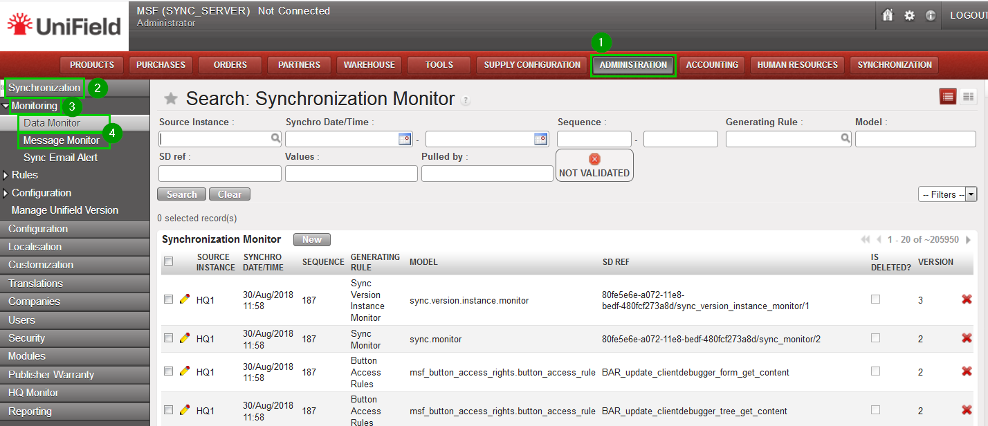 | Click on the menu Administration 1, Synchronistaion 2, Monitoring 3, Data Monitor or Message Monitor 4. You will see all the data or messages that have been pushed and pulled between instances via the synchronization server. | ![]() |