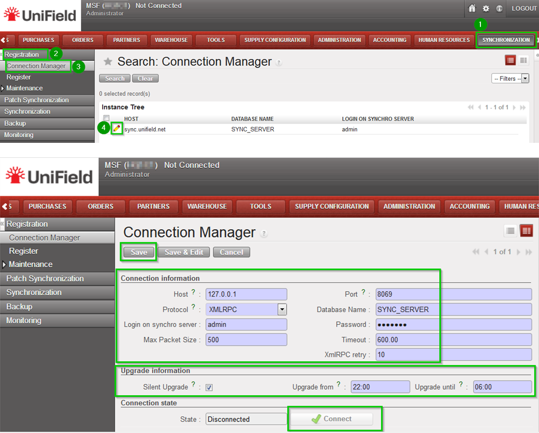 Click on Menu Synchronization 1, Registration 2, Connection Manager 3