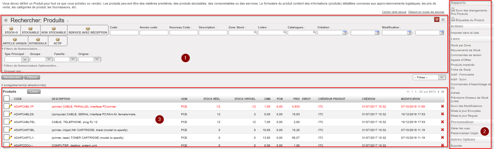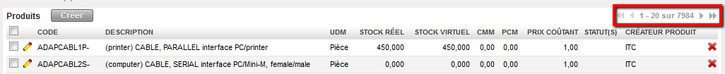 Le système affiche une liste de produits dans la zone de recherche. Cette liste correspond aux valeurs entrées comme critères de recherche dans cette même zone. En l’absence de recherche, une liste complète de tous les articles de la base de données est affichée par ordre alphabétique des codes produit. Seules 20 lignes de produit s’affichent sur l’écran, mais les utilisateurs peuvent consulter les pages suivantes en cliquant sur la flèche « Suivant » située dans le coin supérieur droit de la liste des résultats de recherche, ou encore augmenter le nombre de produits affichés par page (voir figure ci-dessous). La liste des recherches fournit des informations générales sur chacun des produits : le code, la description, l’unité de mesure, le stock réel, l’AMC (Average Monthly Consumption, CMM, Consommation Mensuelle Moyenne), la FMC (Forecast Monthly Consumption, PMM, Prévisions de Consommation Mensuelle), le prix et le statut. Il est aussi indiqué si le produit est de type Unidata ou a été créé localement.