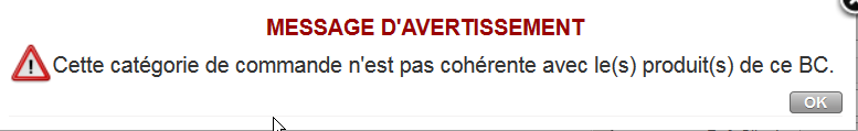 Lorsque la catégorie de la commande et les produits introduits ne sont pas conformes, un message d’avertissement non-bloquant sera affiché.