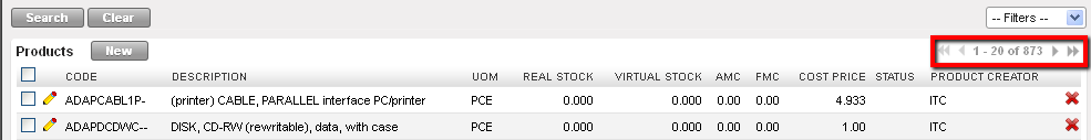 Under the Search Area, the system will display a list of products. The list of products displayed will correspond to the values which were entered as search criteria in the Search Area. If no search has been generated, a complete list of all the database items will be available, in the alphabetical order of their code. Only 20 product lines are displayed by default on the screen, but users can view the next page of products by clicking on the next arrow in the top right hand corner of the search list results, or increase the limit of products to display per page (see image below). The search list displays basic information about each of the products – code, description, unit of measure, real stock, virtual stock, AMC (average monthly consumption), FMC (foretasted monthly consumption), cost price and status. You can also see whether a product is Unidata or local.