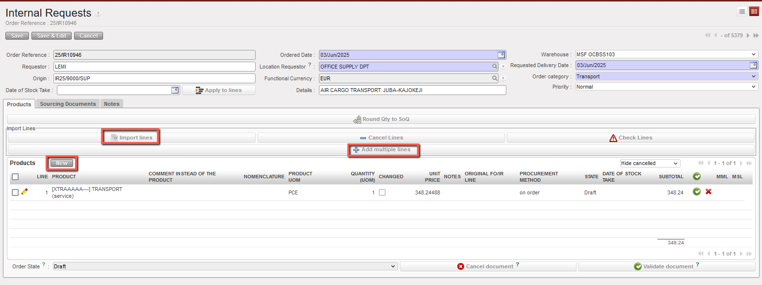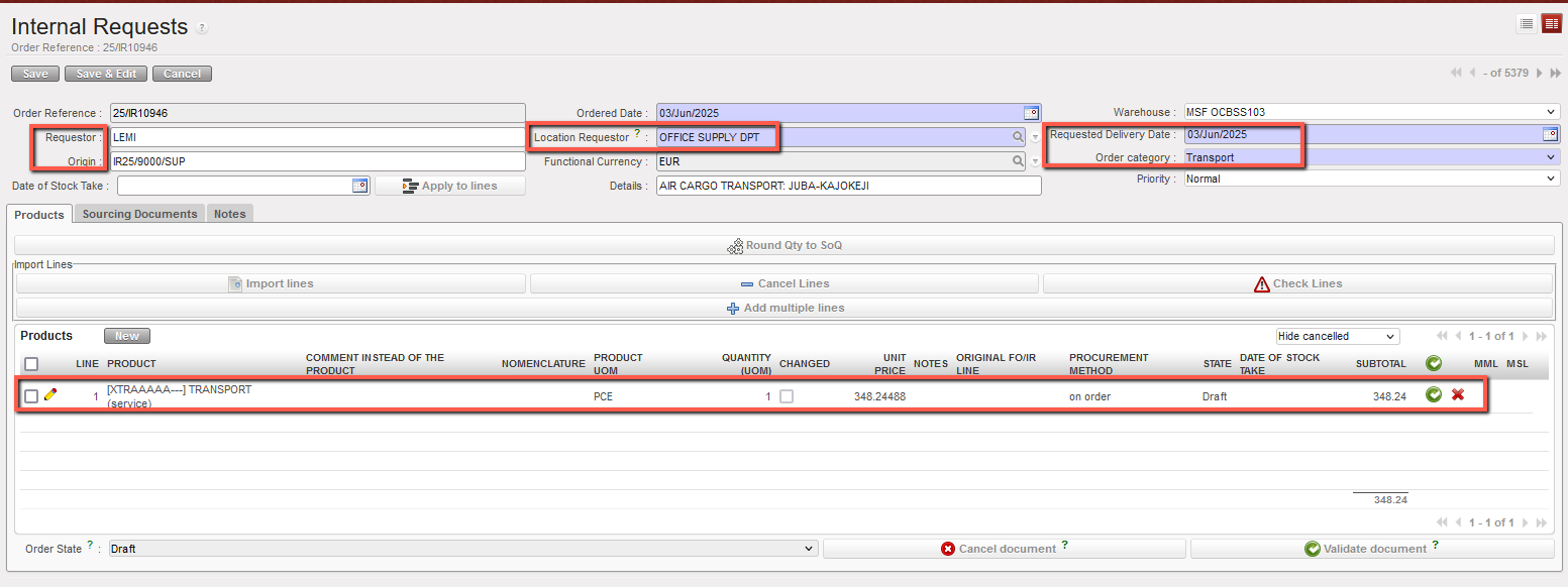 22. The Internal Request is saved in “Draft” status and all the lines of the IR are in “Draft” status.